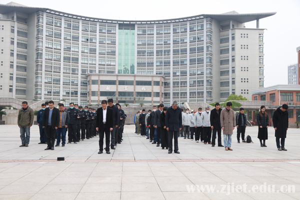 为表达对抗击新冠肺炎疫情斗争牺牲烈士和逝世同胞的深切哀悼,学校下半旗致哀。上午10时,随着防空警报鸣响,学校党委书记劳赐铭、副校长何学军带领值班中层,党校办、组织部、宣传部、防控办、学生处、保卫处、资产与后勤事务管理处工作人员,部分系书记和辅导员等60多人,在学校爱心广场向抗击新冠肺炎疫情斗争牺牲烈士和逝世同胞默哀3分钟,缅怀逝者,致敬英雄。